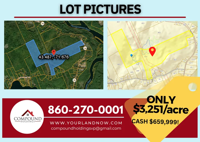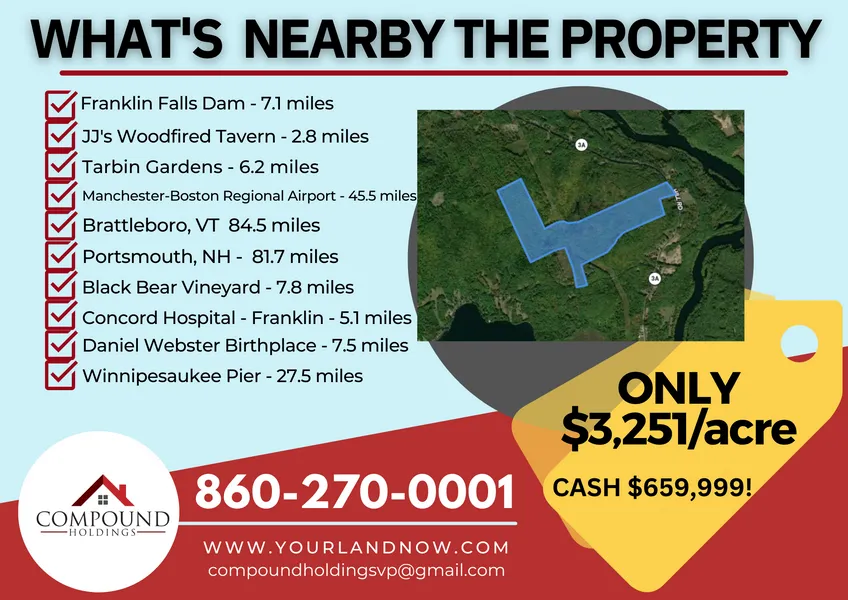203 acres in Merrimack County, New Hampshire HUGE POTENTIAL WITH ENDLESS POSSIBILITIES! 203ac in Franklin, NH BUY NOW for ONLY $659,999 CASH!! Located in Franklin, NH, this 203-acre property has endless possibilities private residence with plenty of land to enjoy, recreation purposes, development potential, hunting, timber rights, etc. The City of Franklin is a community steeped in the historic roots of New Hampshire. The Citys strong civic-mindedness, and its dedication to community service, is founded in the Family Homestead and farm of Daniel Webster, one of New Hampshires and Americas great statesmen. Located at the convergence of the Pemigewasset and Winnipesaukee Rivers, and at the headwaters of the Merrimack River, the City had its economic beginnings in the manufacturing operations that relied upon the rivers for power. These same rivers, along with Webster Lake, help frame the natural landscape that is appreciated b...These same rivers, along with Webster Lake, help frame the natural landscape that is appreciated by residents and visitors alike. The historic nature of the Citys downtown was cemented (bricked actually) by the location of the mills, the construction of Memorial (City) Hall, the Public Library (funded by Andrew Carnegie), and the creation of Odell Park, which provides recreational opportunities for all citizens. Area attractions include the Franklin Falls Dam (7.1 miles) Using land for flood risk management, they are able to create and manage recreational opportunities for every age. Many people enjoy hunting, fishing, hiking, biking, kayaking and snowshoeing on Corps owned land. The U.S. Army Corps of Engineers invites you to come relax at Franklin Falls. There are a variety of outdoor recreation activities for you and your family. Their developed recreation sites are located at the dam, Shaw Cove and Profile Falls. JJs Woodfired Tavern (2.8 miles) is well known for its great service and friendly staff, that is always ready to help you. Fair prices and a homey atmosphere make this the place to go for the best wood-fired pizza around! JJs has received Google 4.5 rating according to the visitors' opinions. Tarbin Gardens (6.2 miles) is a hand-built, five-acre touring garden. English landscape gardens encapsulate a lifetime collection of plants, complete with greenhouses, ponds and animals. A great place for a day out with friends, family or yourself with fun for all ages. This is a peaceful place, great for a date or to catch up, with unique photograph opportunities for amateur and professional. A place to refresh and escape with all the inspiration and information a gardener could need. A true garden venue for weddings, groups and events. Black Bear Vineyard (7.8 miles) spans 18 acres of beautiful rolling hills in Salisbury, NH and is one of the largest vineyards in the state. Enjoy secluded tours throughout the vineyard, chill out at their stone patios and outdoor fireplaces, or try some wines in their unique tasing room. They grow 7 varieties of estate wines, including 4 white wines, 3 red wines and several unique blends. Theyve even won several awards. They are located just 20 minutes from Concord, NH, 15 minutes from Tilton, NH, and ab out 2 minutes from the Daniel Webster Birthplace. Daniel Webster Birthplace (7.5 miles) is associated with the birth and early childhood years of Daniel Webster, one of our countrys most respected orators and statesmen. While the site affords a view of the early years of Daniel Webster, it also provides a glimpse of the 1700s farm life in the infant years of the United States. Exploring the area, it is easy to imagine what it was like growing up in the late 1700s. Winnipesaukee Pier (27.5 miles) one of the most nostalgic locations on Lake Winnipesaukee. With Jet ski rentals, boat sales, pontoon rentals, waterski schools, and restaurants and shops, theres something for everyone. Franklin, NH is part of the SAU #18 School District. Public education is available Pre-K-12. The Paul Smith Elementary (3.3 miles) educates kids in the PK-3 grades, Franklin Middle School (5.5 miles) has grades 4-8; and the Franklin High School (4.2 miles), home of the Golden Tornadoes educates kids 9-12 grades. This 203-acre property is being offered for only $659,999 CASH!+ Show More