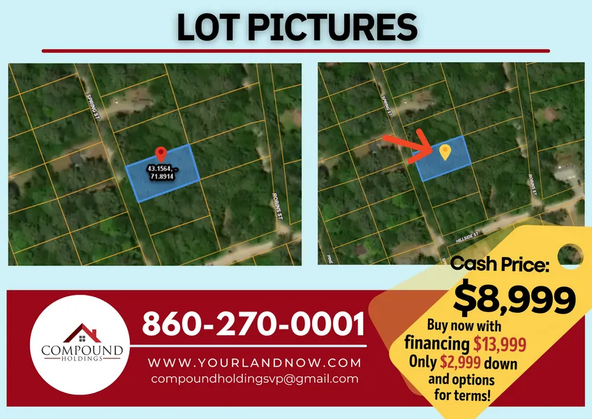 0.22 acres in Hillsborough County, New Hampshire EMERALD LAKE VILLAGE DISTRICT! INCREDIBLE BARGAIN! 0.22ac Hillsboro, NH Seller FINANCING (No Credit Check) at $13,999 with Only $2,999 Down BUY NOW for ONLY $8,999 CASH!! This 0.22-acre property would be the perfect spot for that weekend getaway any time of the year. The Emerald Lake Village District (ELVD) within the Town of Hillsborough, was established in 1979 for the community surrounding Emerald Lake, also known as Gould Pond. Originally a subdivision of seasonal homes, it has developed into primary homes for the majority of its residents. ELVD through a Board of Commissioners manages the well based water system, the beaches, and recreational areas, and approximately fourteen miles of roads. ELVD is also a community of people who enjoy the unique advantage of their own lake and beaches, as well as the proximity of Fox Forest, Pats Peak for skiing, and access to the shopping an...The Emerald Lake Village District (ELVD) within the Town of Hillsborough, was established in 1979 for the community surrounding Emerald Lake, also known as Gould Pond. Originally a subdivision of seasonal homes, it has developed into primary homes for the majority of its residents. ELVD through a Board of Commissioners manages the well based water system, the beaches, and recreational areas, and approximately fourteen miles of roads. ELVD is also a community of people who enjoy the unique advantage of their own lake and beaches, as well as the proximity of Fox Forest, Pats Peak for skiing, and access to the shopping and dining available in Hillsborough, while located close to Concord in the southwest part of New Hampshire. Fox State Forest (4.5 miles) was gifted to the State of New Hampshire by Caroline A. Fox in 1932 to maintain a research and demonstration station in Hillsborough. The Fox Forest Trust has provided funds to demonstrate proper scientific forestry, provide areas for applied forest research, provide programs on natural resource management, and develop a forest for public access and use. The forest encompasses 1,445 acres, the Henry I. Baldwin Forestry Education Center and a farmhouse/Headquarters. There is a well-developed trail system of about 22 miles that receive heavy, year-round use by hikers, cross-country skiers, snowshoers, hunters and mountain bikers. Chef Sean Burt realized his life-long dream of owning his own restaurant when in 1999 he opened Tooky Mills Pub and Restaurant (3.7 miles). Since then, "Tooky's" has become such a fixture in downtown Hillsborough that it seems like we've been here forever. Intervale Farm Pancake House (6.8 miles) opened their more than 30 years ago in Henniker, New Hampshire. They have been serving pancakes, waffles, eggs, and coffee from the same place on Flanders Road since that first day. Stop by and have breakfast with friends and family and become one of the regulars yourself! Enjoy delicious food by the Grazing Room (4.4 miles), Monthly Wine Dinners, Private Dining, Holiday Menus, Breakfasts, Takeout, and Bakery Orders. Bruce Barnes is a celebrated chef for The Grazing Room who has led all culinary operations at the World Bank in Washington, DC and owned two successful East Village restaurants. The Grazing Room is already receiving outstanding reviews and accolades for his expert culinary execution and varied menus. Deering Wildlife Sanctuary (6.5 miles) - In 1979, longtime conservationist and Audubon friend Ruth Crary Young donated 485 acres of her land to the Society after she accepted Audubons wildlife habitat management proposal. The gift was accompanied by an endowment to help support the basic maintenance of the property, which enables Audubon to fulfill its stewardship obligation and ensure the continued protection and preservation of this wildlife habitat for the enjoyment and enrichment of future generations. Shopping anyone top names are at these outlet malls: Tanger Outlets (45.9 miles), Merrimack Premium Outlets (51 miles), and Kittery Premium Outlets, Maine (82.3 miles). Maybe youd like to take in some history at The Franklin Pierce Homestead (6.7 miles). Franklin Pierce Homestead was the home of the 14th president of the United States from his infancy until his marriage in 1834. The Pierce Homestead is a fine example of New Hampshire village architecture. It is a two-story frame building with a hipped roof. Built by Pierce's father in 1804, it reflects the gracious and affluent living of the nineteenth century. A ballroom, which extends the entire length of the second floor, was used for entertaining neighbors and distinguished families of the state and nation. Franklin Pierce shared Daniel Webster's dedication to national unity and led our country during the most trying of times, the time of slavery. Private tours & large group tours can be arranged. The nearest hospital is Monadnock Community Hospital, which is only 22.6 miles from the property. This 0.22-acre property is being offered with seller financing (no credit checks!) at $13,999 with only $2,999 down OR for $8,999 CASH. The price is $13,999 if you need financing. The down payment required is $2,999 with either: 36 payment option of $370 x 36 months or 48 payment option of $295 x 48 months or 60 payment option of $250 x 60 months+ Show More